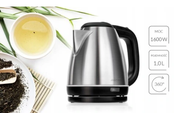 - W czajniku może naraz być podgrzewane aż 1 l wody, pozwalający sprawnie zagotować wodę na herbatę dla 4 osób dzięki mocy 1600W.