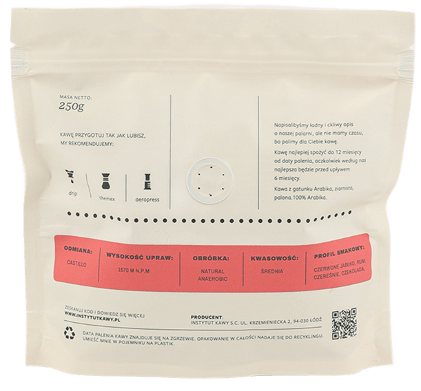 Kawa pochodząca z Kolumbii z regionu Circasia odmiany Castillo wypalona została w taki sposób aby wydobyć wyraźne nuty owocowe głównie dojrzałych, czerwonych jabłek oraz delikatnej kwasowości czereśni połączonych z głęboką czekoladą i wyraźnymi akcentami rumu.